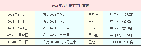 2017年8月提車吉日查詢,2017年8月提車吉日一覽表
