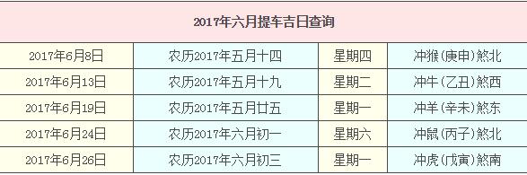 2017年6月提車吉日查詢,2017年6月提車吉日一覽表