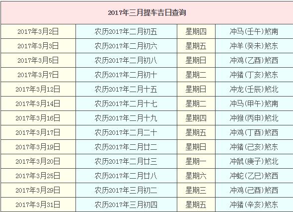 2017年3月提車吉日查詢,2017年3月提車吉日一覽表