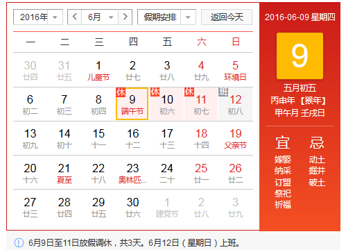 根據(jù)中國國務(wù)院網(wǎng)站放假安排顯示,今年端午節(jié)一共放假三天,從2016年6月9日放假至6月11日。其中6月9日為周四、6月10日為周五、6月1 …